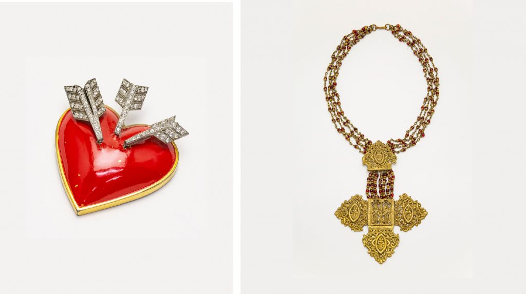 【右】シャネル《ネックレス「ビザンチンクロス」》 制作:ロベール・ゴッサンス、1960年頃、ガラスビーズ、メタル、小瀧千佐子蔵