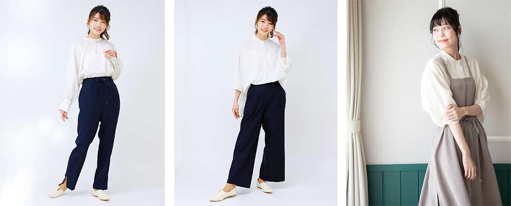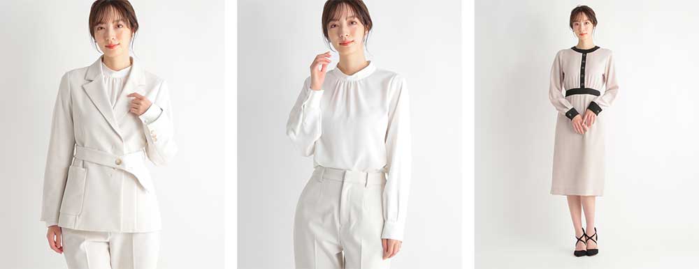 フェミニンで上品なデザインを得意とするAndemiuとタッグを組んだのは、商業施設の新静岡セノバ。デザインしたのはインフォメーションスタッフの制服で、Andemiuの人気アイテムをベースにスタッフの意見を取り入れつつ完成に至ったそう。制服はワンピースとジャケット&パンツの2型で、スカーフを取り入れることで着こなしに変化をつけられる工夫も。エレガントでありながらもお手入れが簡単で動きやすいなど、こちらも着る人の目線に立った機能性の高さを兼ね備えています。